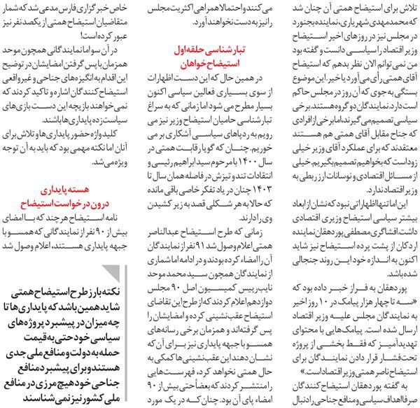 روزنامهٔ همشهری: یکشنبه سرنوشت‌ساز، آغاز شمارش معکوس برای استیضاح همتی