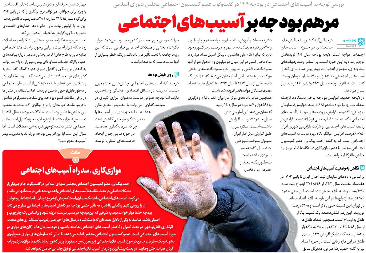 روزنامهٔ جام‌جم: مرهم بودجه بر آسیب‌های اجتماعی