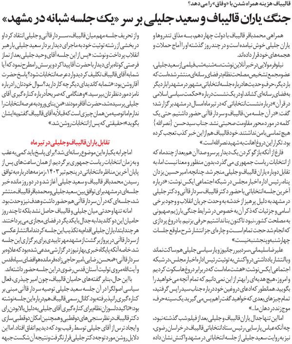 روزنامهٔ توسعه ایرانی: جنگ یاران قالیباف و سعید جلیلی بر سر «یک جلسه شبانه در مشهد»