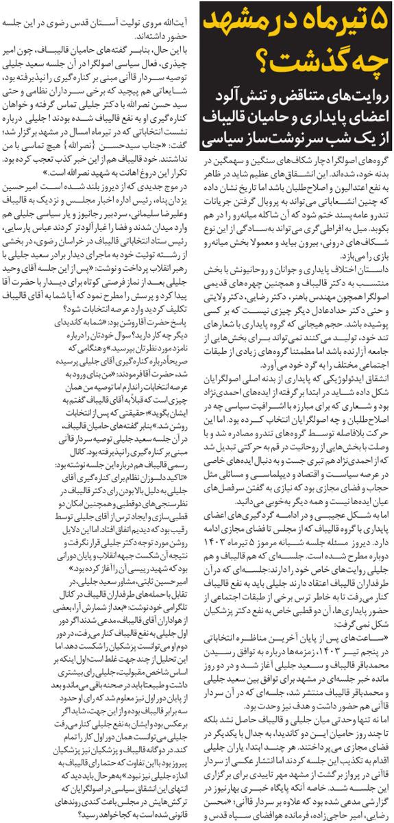 روزنامهٔ توسعه ایرانی: جنگ یاران قالیباف و سعید جلیلی بر سر «یک جلسه شبانه در مشهد»