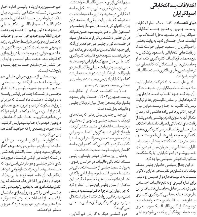 روزنامهٔ دنیای اقتصاد: اختلافات پسا انتخاباتی اصولگرایان
