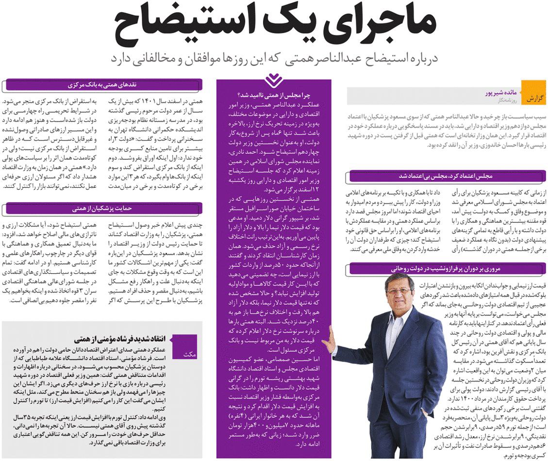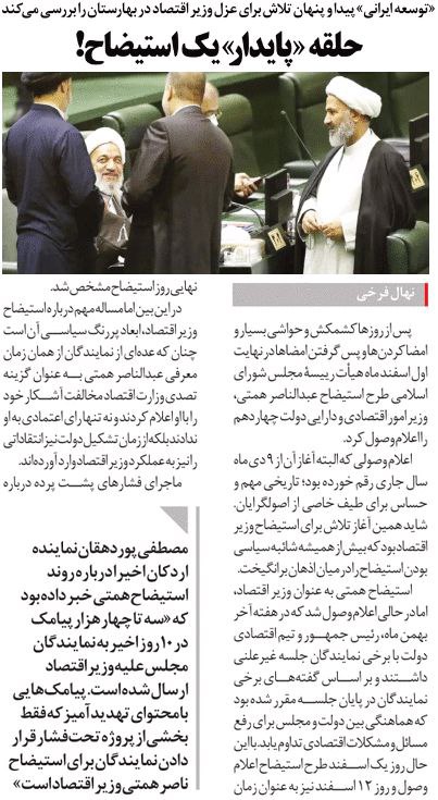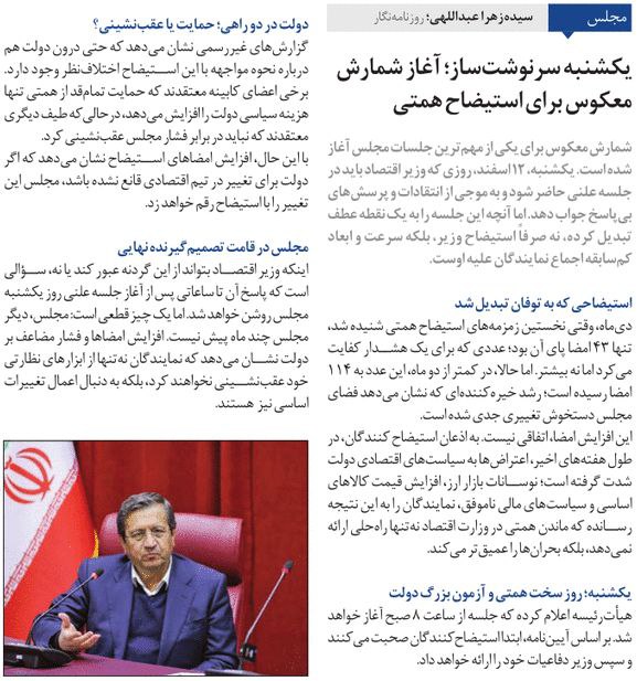 روزنامهٔ همشهری: یکشنبه سرنوشت‌ساز، آغاز شمارش معکوس برای استیضاح همتی