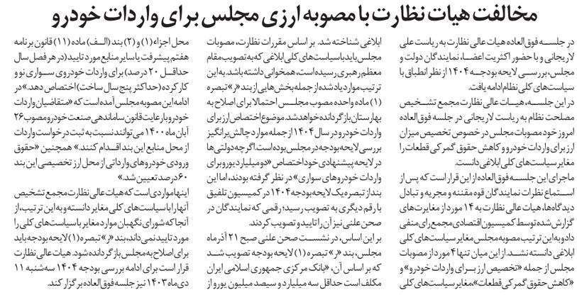 روزنامهٔ اعتماد: مخالفت هیات نظارت با مصوبه ارزی مجلس برای واردات خودرو