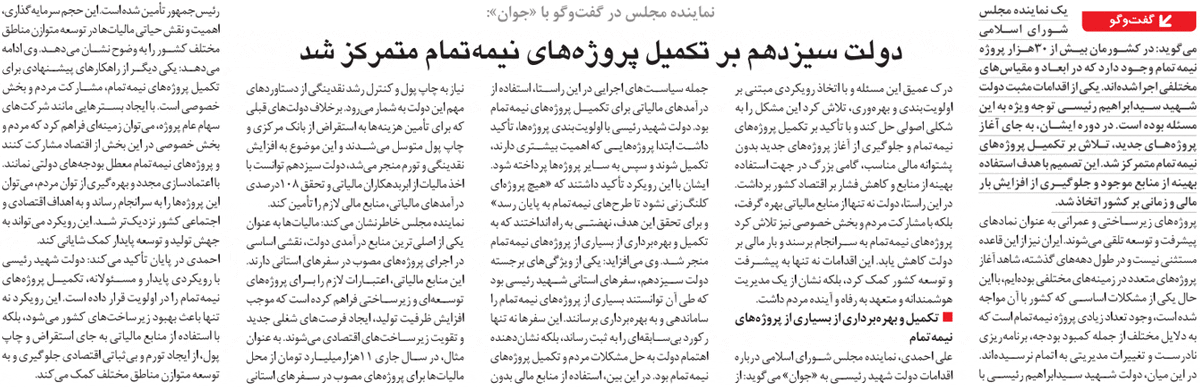 روزنامهٔ جوان: دولت سیزدهم بر تکمیل پروژه‌های نیمه‌تمام متمرکز شد