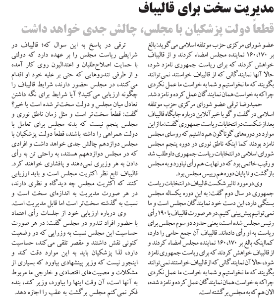 روزنامهٔ ابرار: مدیریت سخت برای قالیباف